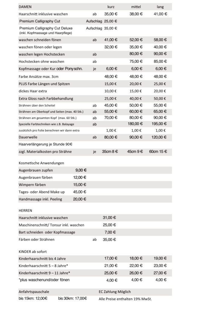 PS: Aufwendige Typveränderungen oder Farbtechniken werden vorab preislich besprochen.