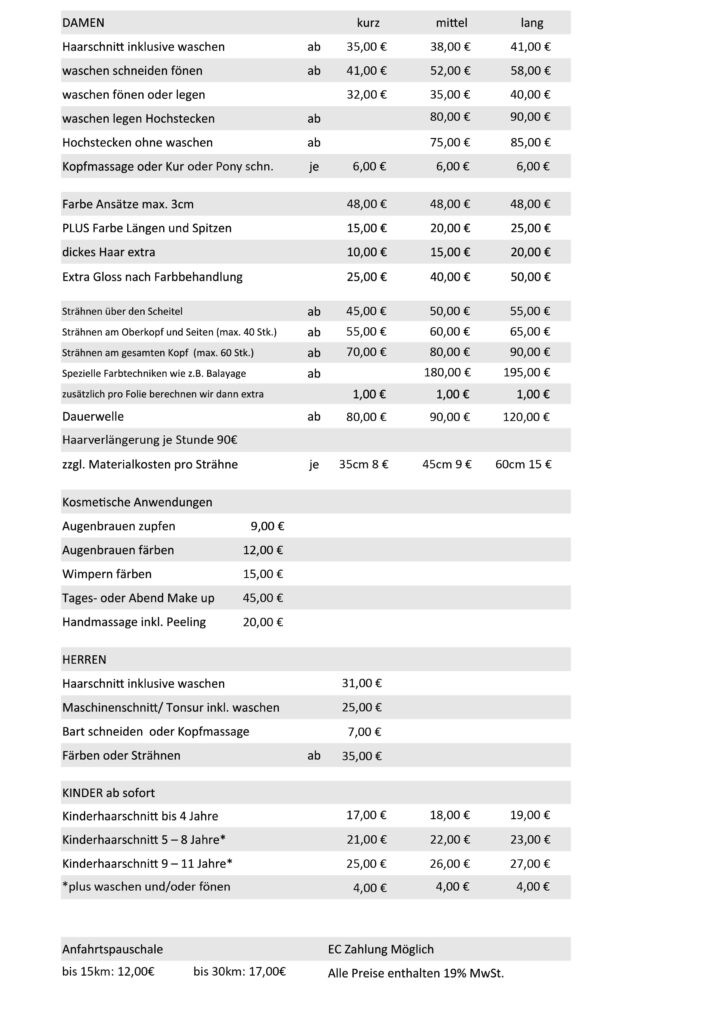 PS: Aufwendige Typveränderungen oder Farbtechniken werden vorab preislich besprochen.